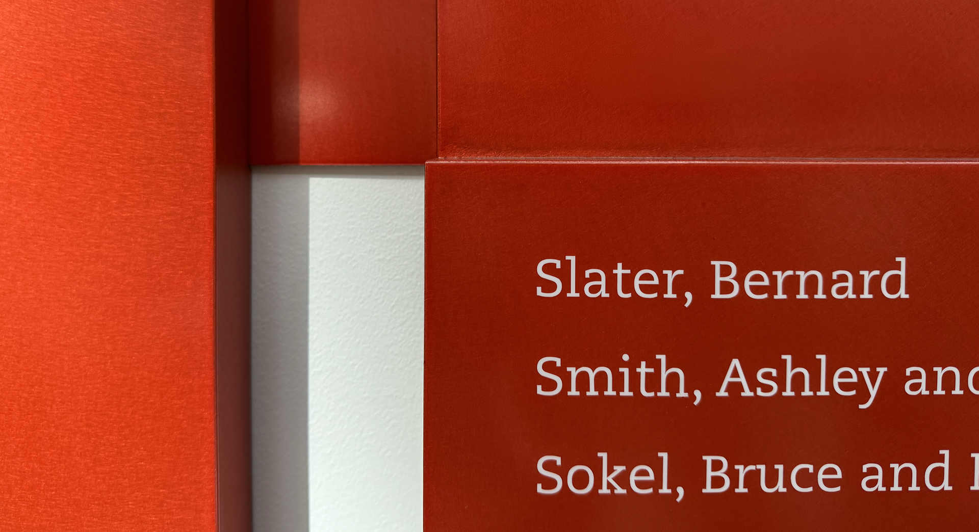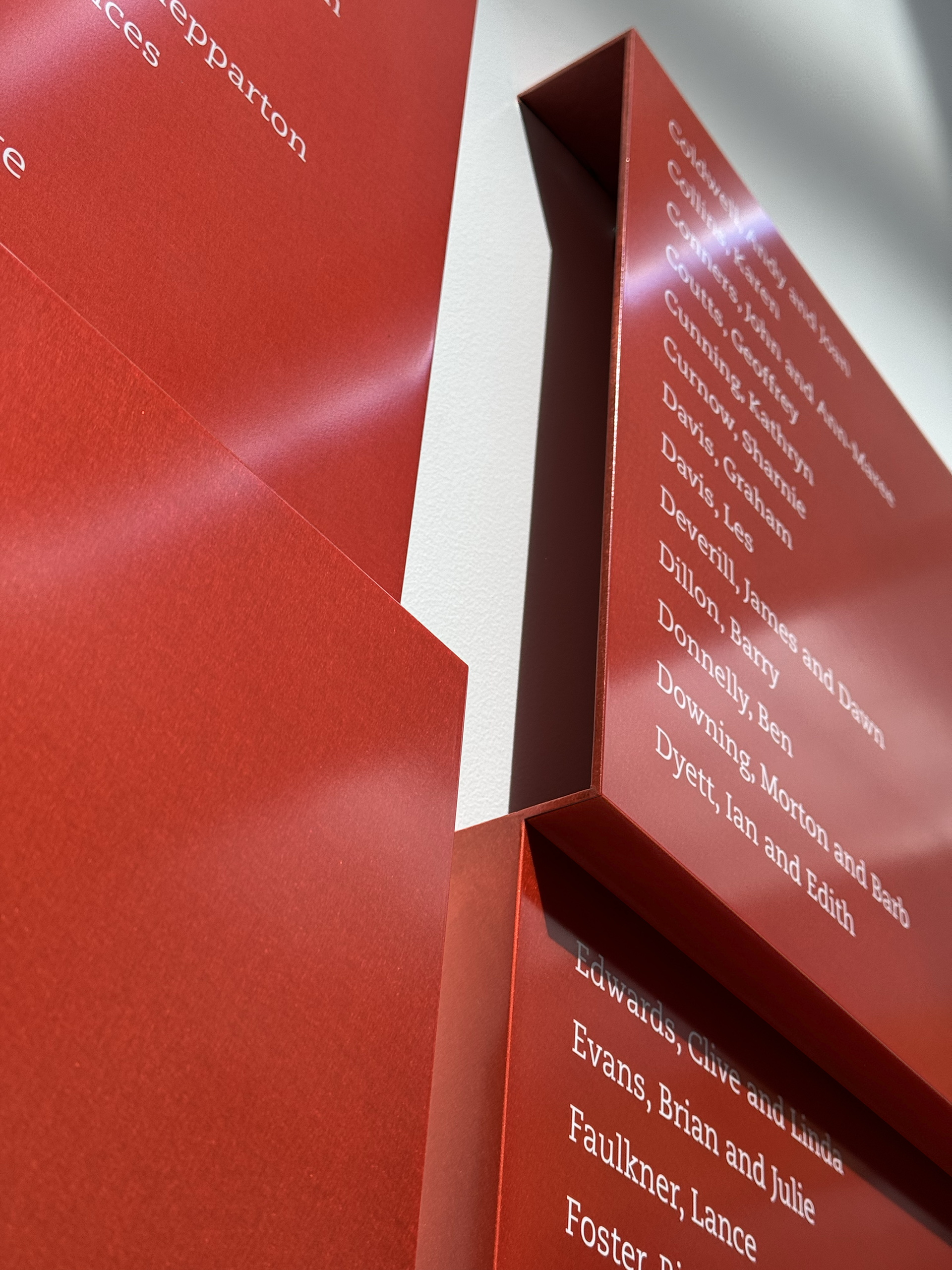 The outcome is a continuous linear composition of 6mm thick square aluminium planes, set forward and back to help categorise donor groups. This stepped language draws directly from the hospital’s main façade, while the orange tone reflects the St John of God brand colour. Applied in multiple translucent paint layers, it creates a remarkable depth and luminosity across the surface. Installed within the hospital’s main atrium, the piece immediately captures attention on entry, creating an immediate sense of recognition and gratitude.