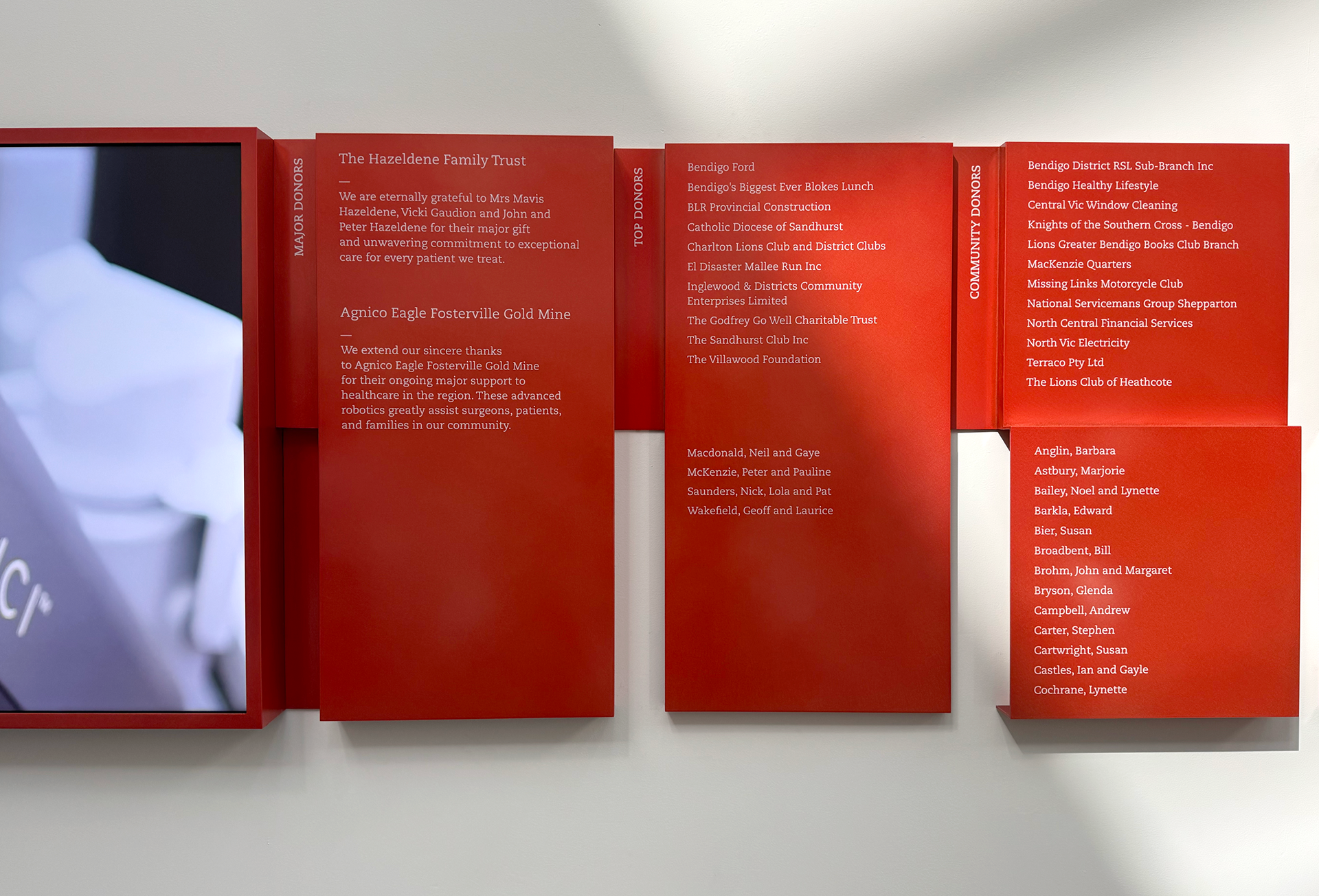 We’ve recently finalised the design and supervised the implementation of the donor signage at St John of God Hospital Bendigo. The brief was to create a lasting expression of gratitude, recognising the individuals, families, businesses who together raised over $2.8 million to bring advanced robotic surgery to Bendigo, reducing the need for patients to travel to Melbourne.